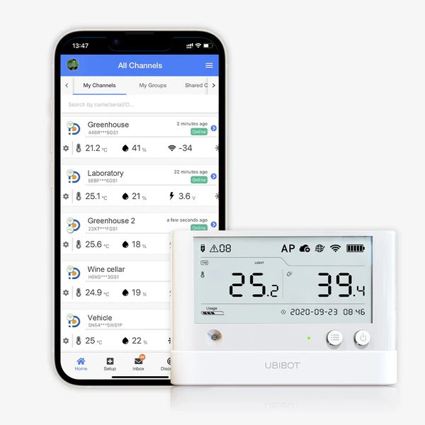 The WS1 Pro-L features a 4.4” LCD screen that delivers real-time data at a glance, including temperature, humidity, light levels, and readings from connected external sensors. Equipped with two on-board USB ports, it supports RS485 interface probes such as the TH30S-B, soil sensors, and PT-100, as well as the option to connect two temperature probes simultaneously using a USB splitter. Its high-accuracy sensor ensures precise measurements, with temperature accuracy within ±0.2°C from -20°C to 60°C, humidity accuracy within ±2% RH (10% to 90% RH), and ambient light accuracy within ±10% (0.01 to 157k lux). The device can store up to 50,000 data points in its built-in memory, enabling uninterrupted monitoring even when offline, and automatically synchronizes stored data to the UbiBot platform upon reconnection. Designed for versatility, the WS1 Pro-L operates on either 4 AA batteries or a micro USB connection, ensuring continuous and reliable performance in any monitoring environment.